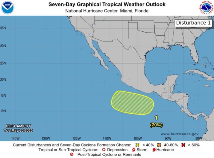 El ministerio de Medio Ambiente informa que una área de baja presión podría formar un ciclón tropical durante el fin de semana o los primeros días de la siguiente semana al sur de la costa mexicana. Actualmente presenta un potencial de desarrollo ciclónico de 20 % para los próximos 7 días.